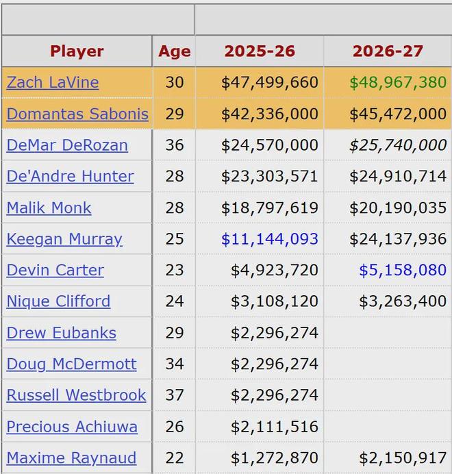 值得一提的是,国王队14连败已经追平队史纪录。他们上一次遭遇14连败,还要追溯到1972年。更扎心的是,小萨和拉文本赛季的薪水都超过了4000万美元,他俩的年薪加起来接近9000万美元,下赛季年薪合计超过9400万美元。