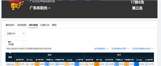 第一阶段过后,广东男篮的投篮分布,中距离占比仅为25.6%,篮下占比为33.8%,三分占比则高达40.5%。由此可见,外线投射是广东队的主要得分手段,球队更强调外线进攻。但问题是,他们进攻端的三分命中率只有33.1%,该数据仅排在联盟第17位,整体效率很低。