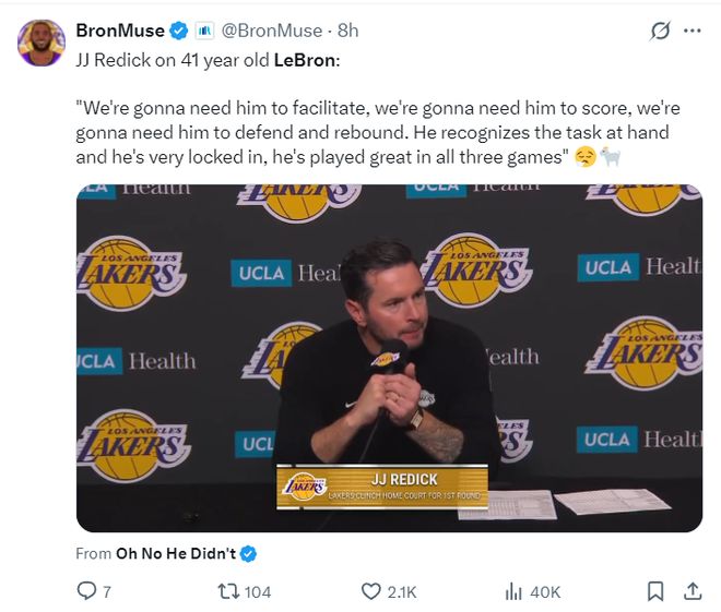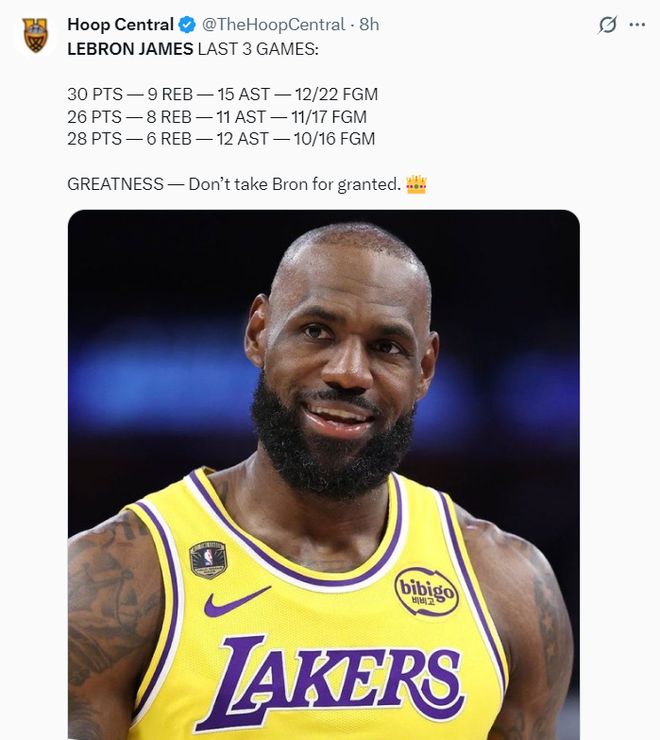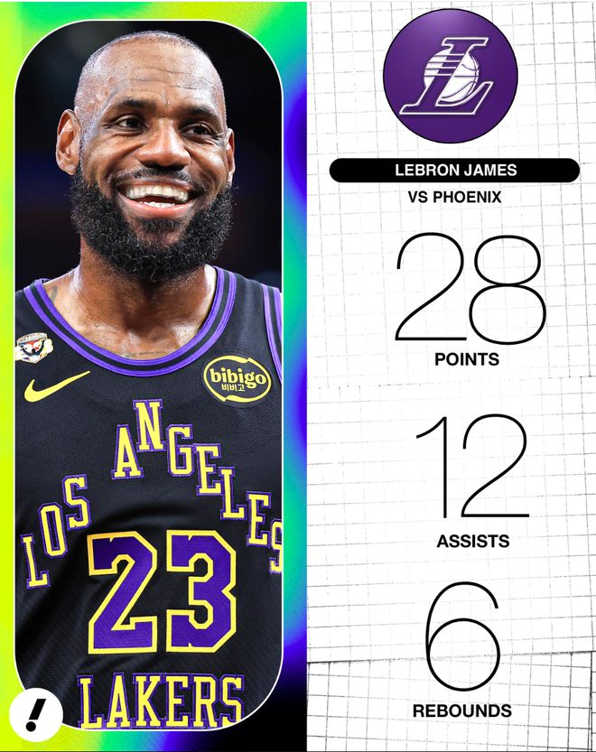 41岁的勒布朗-詹姆斯在对阵太阳的比赛中,仅仅出战32分钟,16中10,三分2中2,拿到28分12助攻6篮板4抢断,他的得分、助攻都是两队最高,勒布朗也提前打卡下班,值得一提的是勒布朗连续两场比赛都是提前打卡。