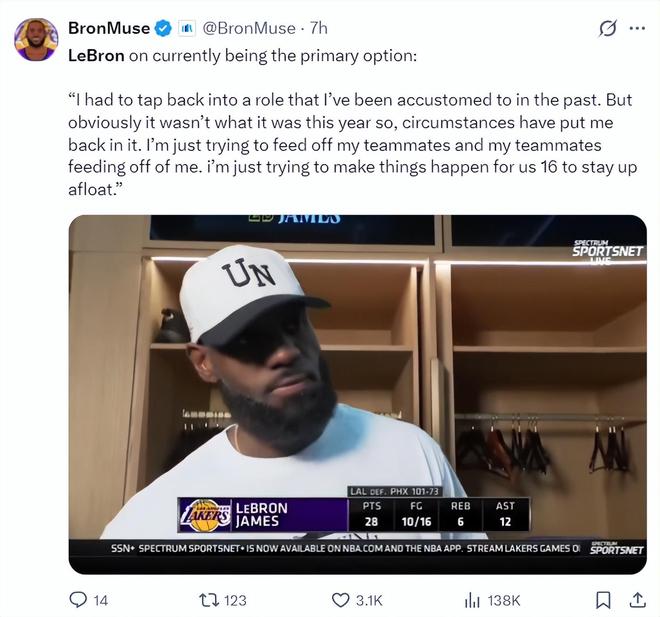詹姆斯在赛后谈到自己重回核心:我不得不重新适应过去的角色,我这是环境逼迫又回到原来的角色上。我努力的让队友们都参与进来,这样队友们可以帮我提供帮助,团队一同贡献我们就能继续前进。
