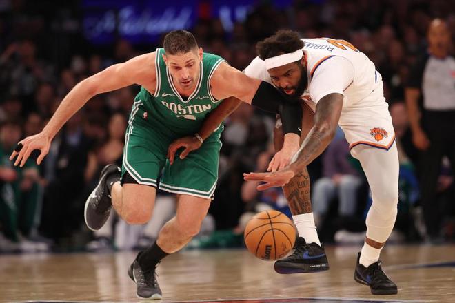凯尔特人过去4场收获4连胜,尼克斯过去3场收获3连胜,本赛季前三次交锋尼克斯2胜1负处于上风。本场凯尔特人缺少布朗,尼克斯缺少科勒克。首节开局凯尔特人0-7落后,凯尔特人一波9-0攻势反超,尼克斯连得4分。普里查德引领一波8-0攻势夺回领先,凯尔特人继续维持21-14领先,尼克斯持续反扑缩小差距,首节结束凯尔特人29-26领先尼克斯。首节凯尔特人三分13中3,普里查德8中5得到11分与塔图姆6中2得到6+6+2;尼克斯三分10中4,布伦森2记三分10分与唐斯4中0得到0分4篮板。