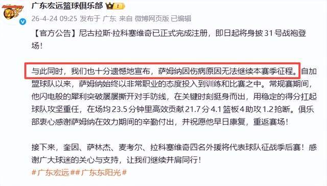 北京时间4月24日消息,CBA外援更换截止日,广东宏远官方宣布:正式取消萨姆纳的注册,这位赛季场均贡献21.7分、4.1篮板、4.0助攻的得分利器,就此告别本赛季的季后赛征程。