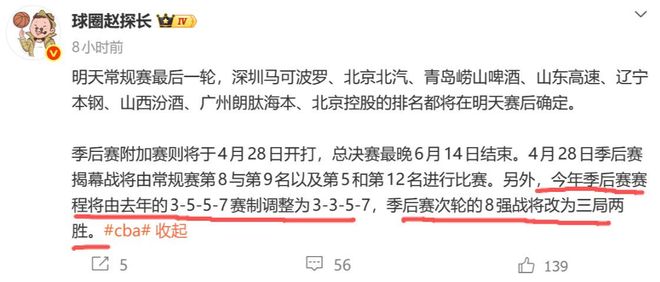 据媒体人球圈赵探长透露,CBA季后赛附加赛将于4月28日开打,总决赛最晚6月14日结束,另外今年季后赛赛程由去年的3-5-5-7调整为3-3-5-7。也就是说季后赛次轮由去年的5局3胜,改为3局2胜。这也引起了球迷的热议:“无聊的常规赛打这么多轮,季后赛反而缩水”、“草台班子,没有规律性,想改就改。”