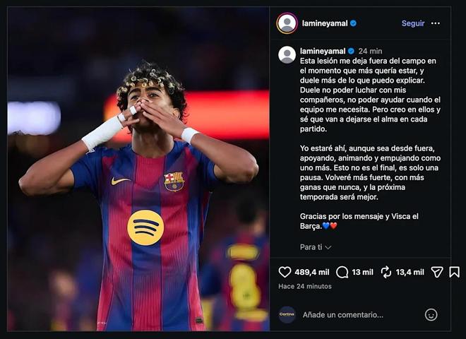 赛季冲刺阶段,18岁的拉明·亚马尔(Lamine Yamal)在社交媒体写下这句话:"这伤让我在最想上场的时候缺席,痛得无法形容。"没有公关话术,没有励志鸡汤,一个年轻球员把挫败感摊在了台面上。