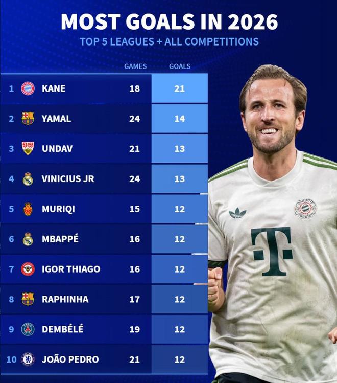 北京时间4月23日,德转统计出了2026年欧洲五大联赛+所有赛事进球最多的10名球员,哈里-凯恩以18场打进21球的数据高居第一,亚马尔14球排名第二。