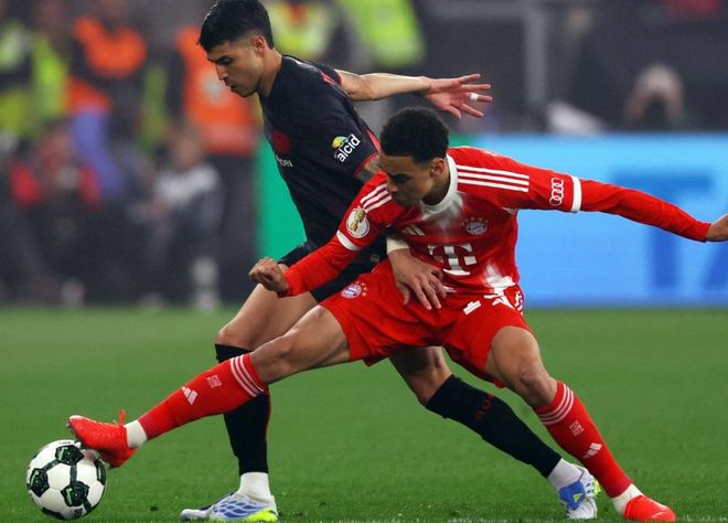 比赛刚开始不久,拜仁创造出机会。于帕梅卡诺在门前抢射,踢高了。第17分钟,路易斯-迪亚斯在禁区左侧起脚兜射。门将飞身把球扑了出去。2分钟后,哈里-凯恩在禁区内直面门将,射门被挡了出去。第22分钟,拜仁进球了!穆西亚拉在禁区右侧送出横传。凯恩停球后射门,球进了!7分钟后,奥利塞在禁区外尝试一脚远射。门将把球没收。第43分钟,帕夫洛维奇犯规,被出示黄牌。半场结束,拜仁1-0领先勒沃库森。