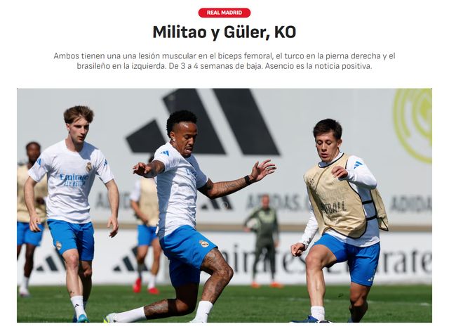 《阿斯报》指出,米利唐、居莱尔都需要休战3-4周时间。这意味着,两人的2025-26赛季已经结束。